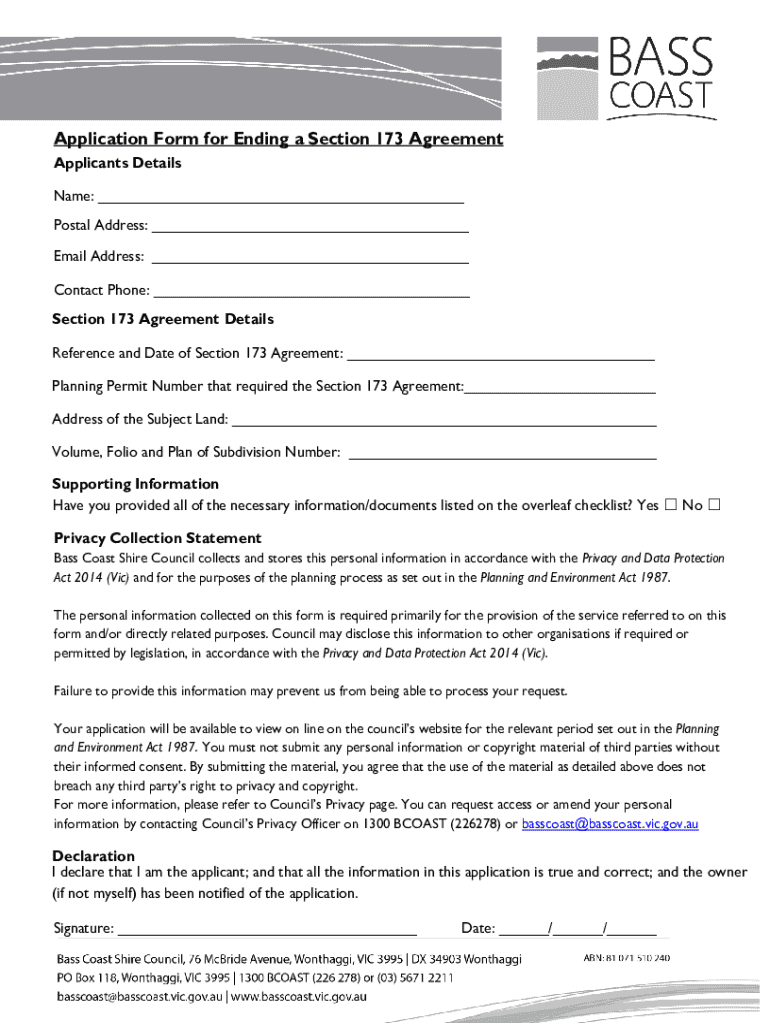 Get the free Application Form for Ending a Section 173 Agreement