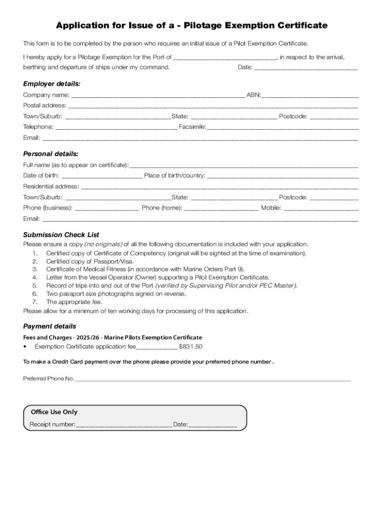 This document serves as an application for a Marine Pilot Exemption Certificate, outlining the requirements and guidelines necessary for pilots to obtain exemption to navigate Australian crewed vessels