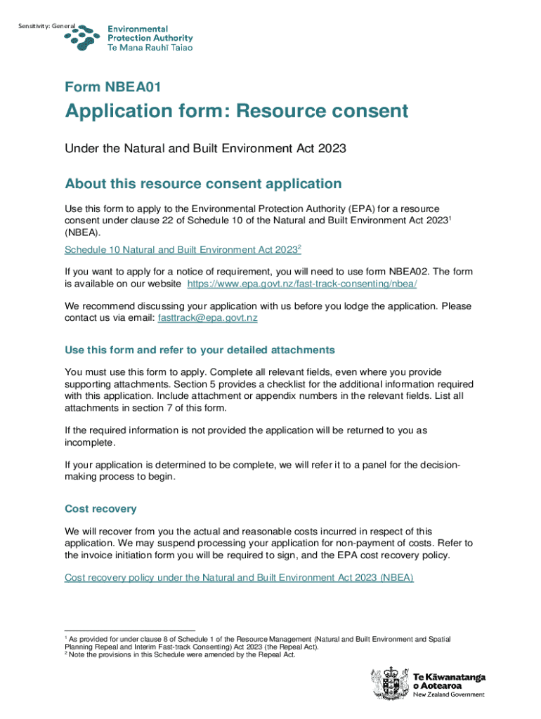This document is an application form used to apply for resource consent under the Natural and Built Environment Act 2023. It outlines the process, required information, and the responsibilities of
