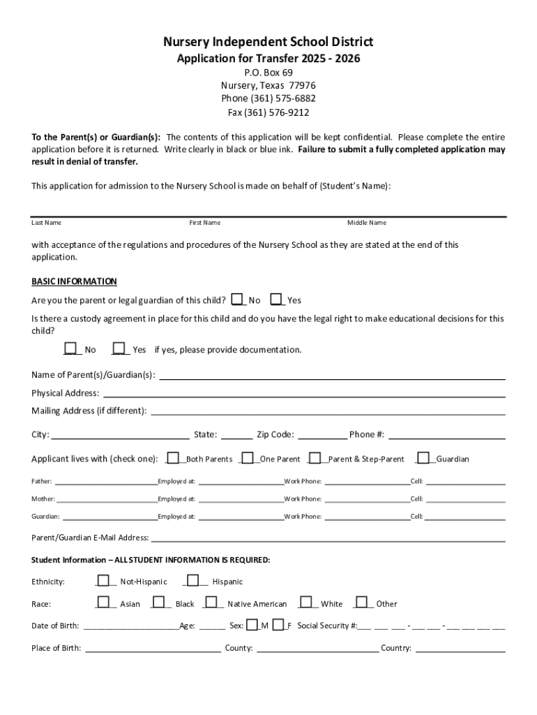 For any questions or additional support regarding the Nursery Independent School District form, it is advisable to reach out directly to the school district office. They can provide up-to-date information and personalized assistance to ensure your queries are resolved.