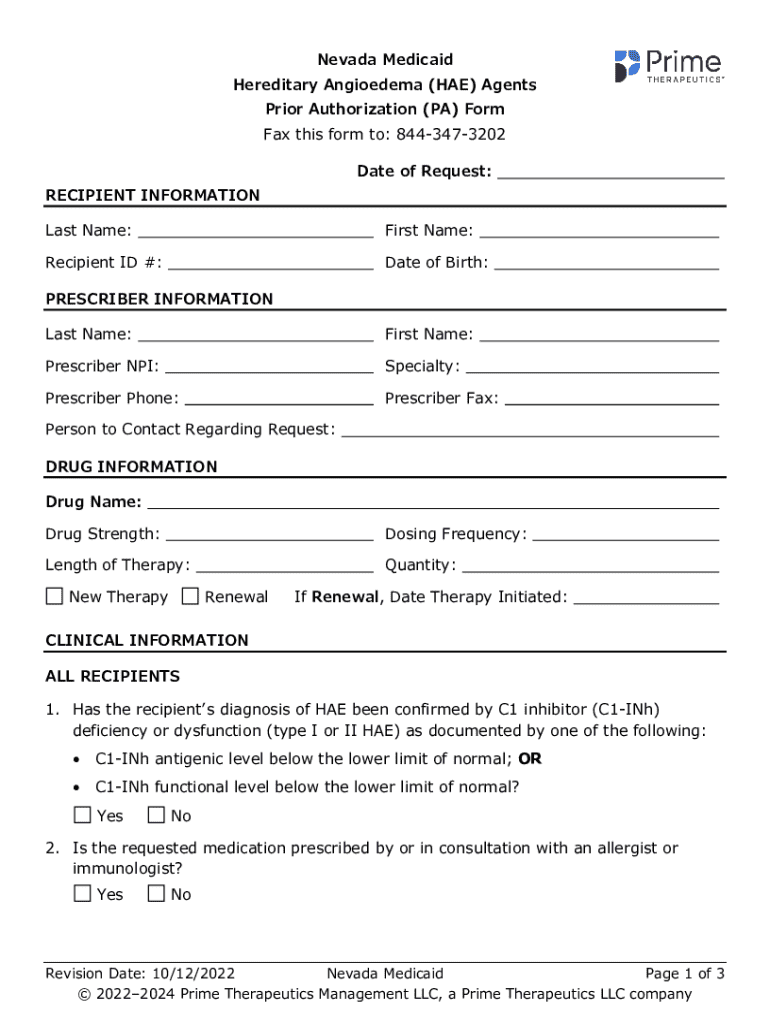 Get the free Nevada Medicaid Hae Agents Prior Authorization Form
