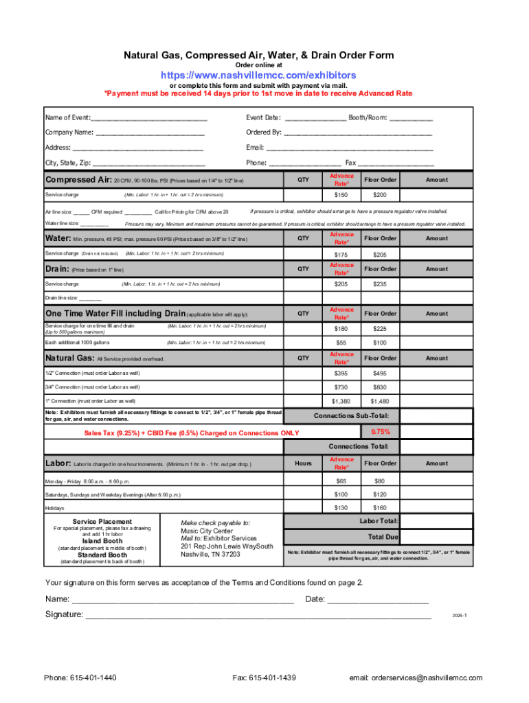 This document is an order form for exhibitors to request utility services such as natural gas, compressed air, water, and drain services at Nashville\'s Music City Center. It includes details on pricing,