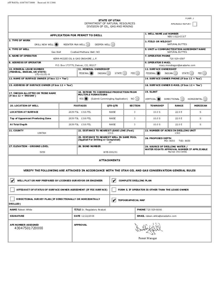 API Well No: 43047501720000 API Well No: 43047501720000Received: Received: 10/2/2008 10/2/2008FORM FORM 3STATE STATE OF OF UTAH UTAH DEPARTMENT DEPARTMENT OF NATURAL NATURAL RESOURCES RESOURCES DIVISION