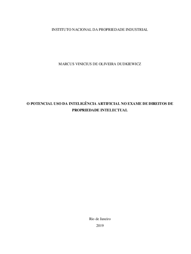 Este documento é uma dissertação de mestrado que avalia o potencial uso da inteligência artificial nos processos de exame de direitos de propriedade intelectual, abordando as implicações, metodologias