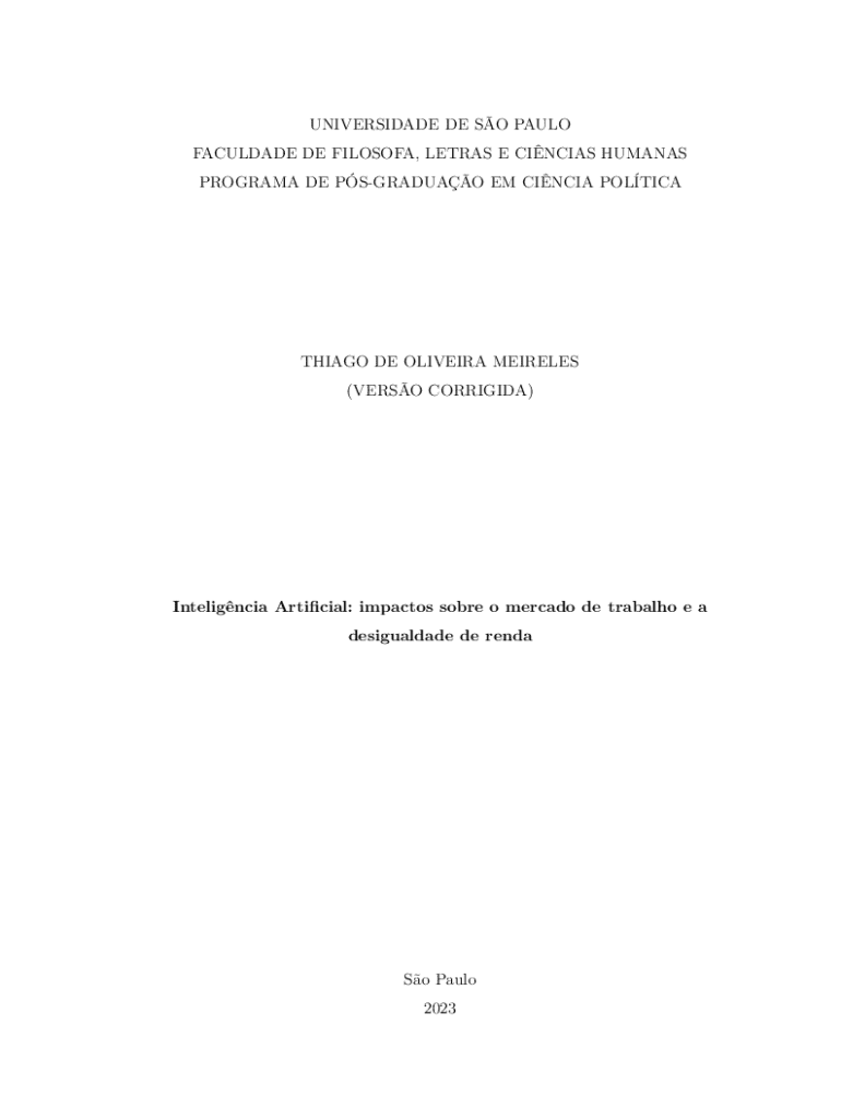 Tese de doutorado que explora os impactos da inteligência artificial no mercado de trabalho brasileiro, analisando as mudanças nas ocupações e a desigualdade de renda como resultado da automação