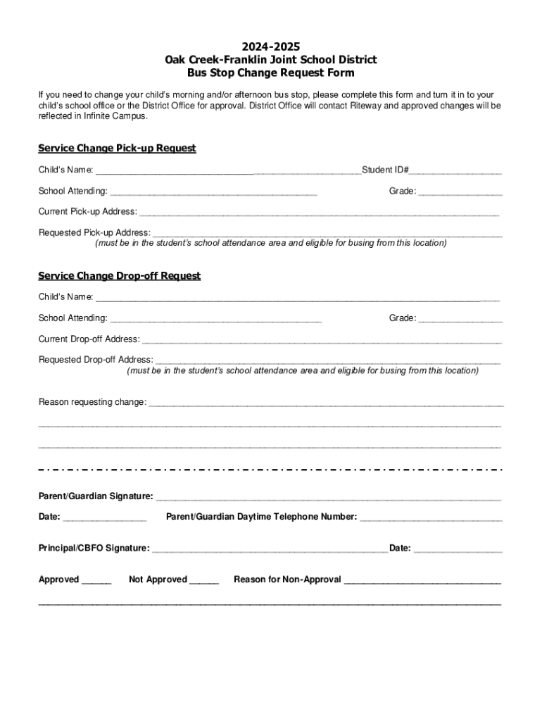 This form is for requesting changes to a child’s morning and/or afternoon bus stop within the Oak Creek-Franklin Joint School District.