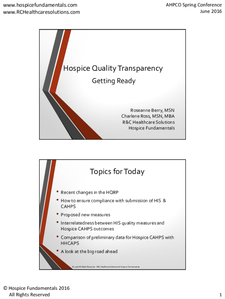This document outlines the agenda and key topics discussed at the AHPCO Spring Conference regarding hospice quality reporting and compliance with healthcare regulations, focusing on new measures and