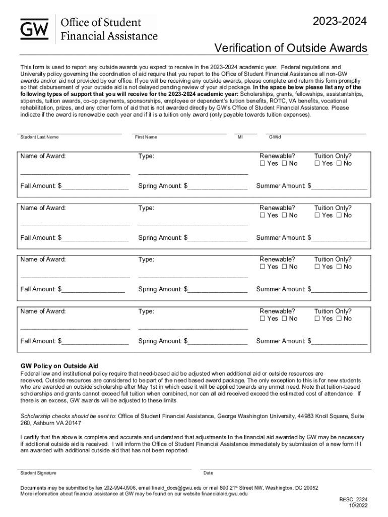 To initiate the verification process, certain criteria must be met. Typically, students must submit documentation of any outside awards they have received. This includes any scholarship letters, grant notifications, and proof of donor contributions. Each institution may have specific requirements regarding the type of awards that necessitate verification.