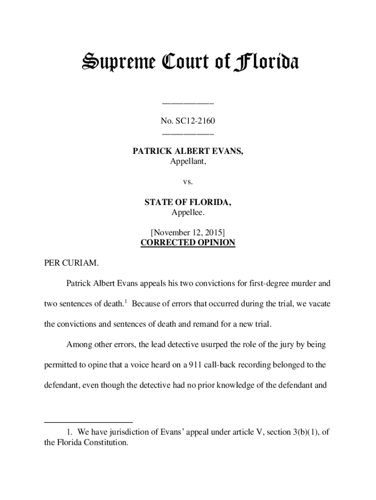 This document presents the opinion of the Supreme Court of Florida regarding the appeal of Patrick Albert Evans against the State of Florida over his convictions for first-degree murder and sentences