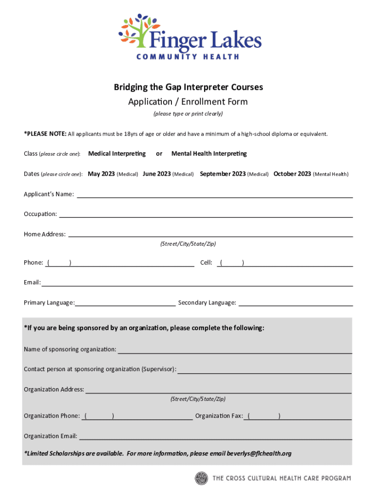 This form is to be filled out by applicants for the Bridging the Gap Interpreter Courses, specifically for Medical and Mental Health interpreting. It collects personal information and details regarding