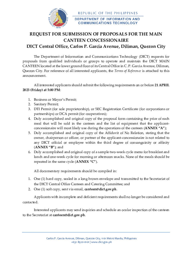 This document outlines the request for proposals from qualified individuals or groups to operate and maintain the DICT Main Canteen, detailing requirements, procedures, and terms associated with the
