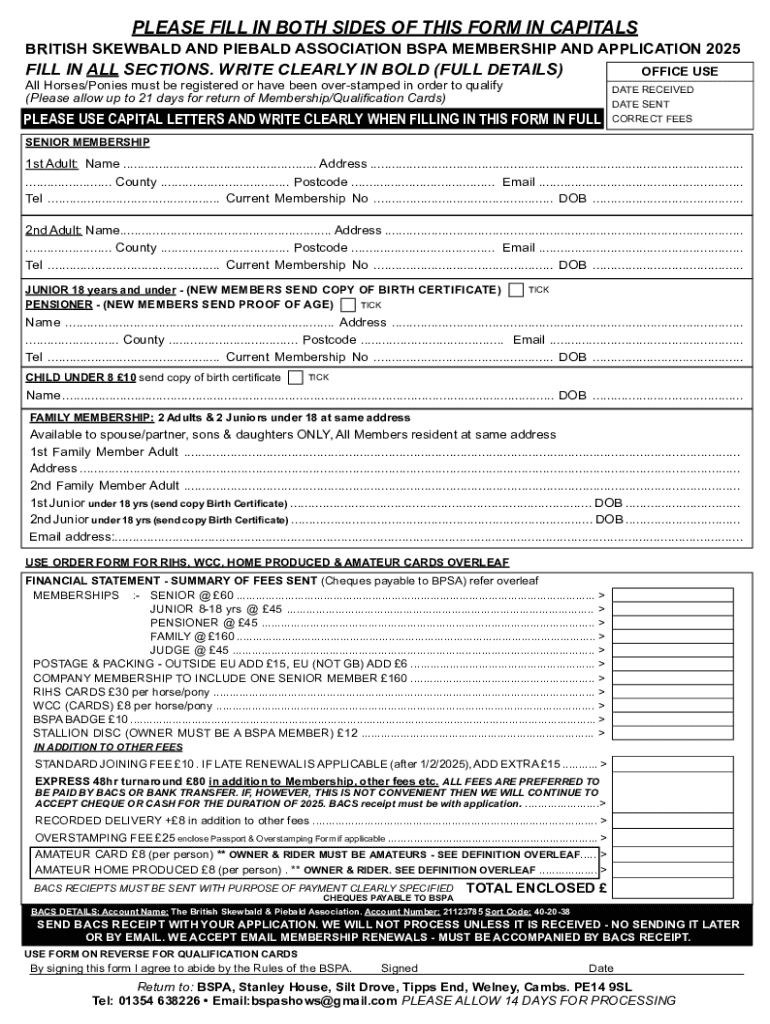 Este formulario es para solicitar y renovar la membresía de la British Skewbald and Piebald Association para el año 2025, incluyendo información sobre qué documentos se requieren y las tarifas