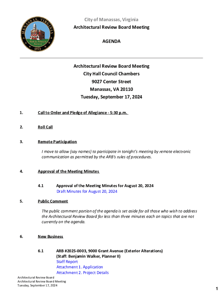 This document outlines the agenda for the Architectural Review Board meeting scheduled for September 17, 2024, including times for various segments, public comments, new business, and staff reports.