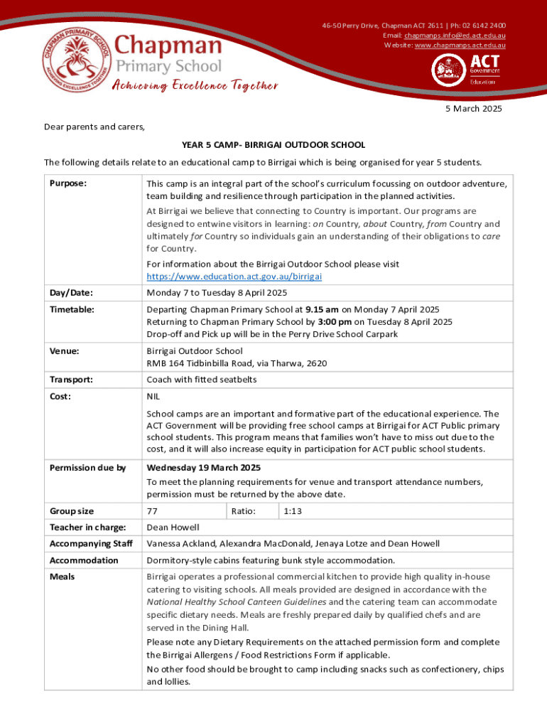 This document provides information and permission details for Year 5 students attending a camp at Birrigai Outdoor School, including logistics, costs, dietary requirements, and behavioral expectations.