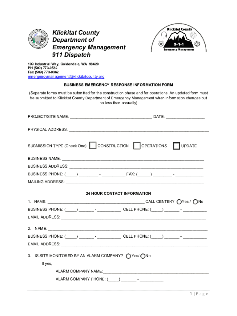 This form is used by businesses to provide key emergency response information to the Klickitat County Department of Emergency Management. It includes details about the business site, emergency contacts,