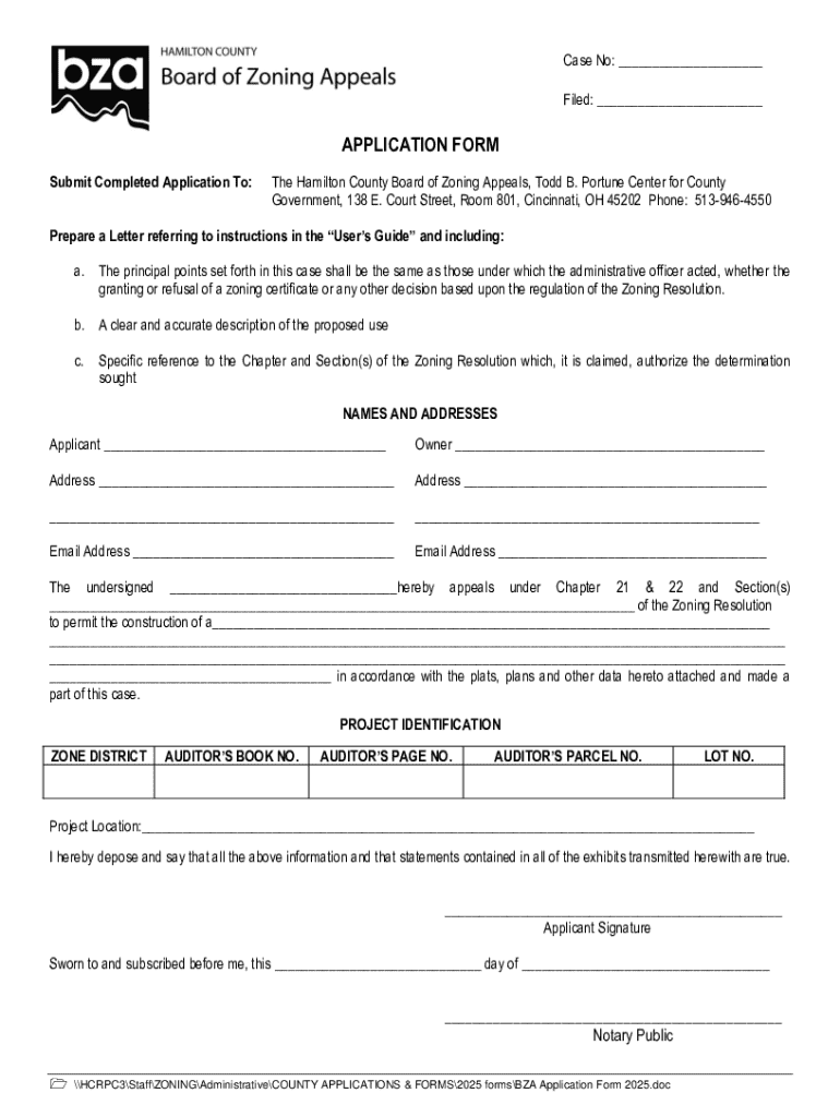 This document serves as an application form for appealing zoning decisions or requesting variances in Hamilton County, Ohio. It includes sections for applicant and property information, project details,