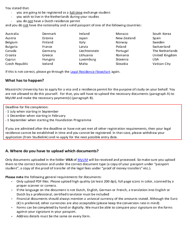 This document outlines the process and requirements for applying for a visa and residence permit to study at Maastricht University in the Netherlands as a full-time exchange student.