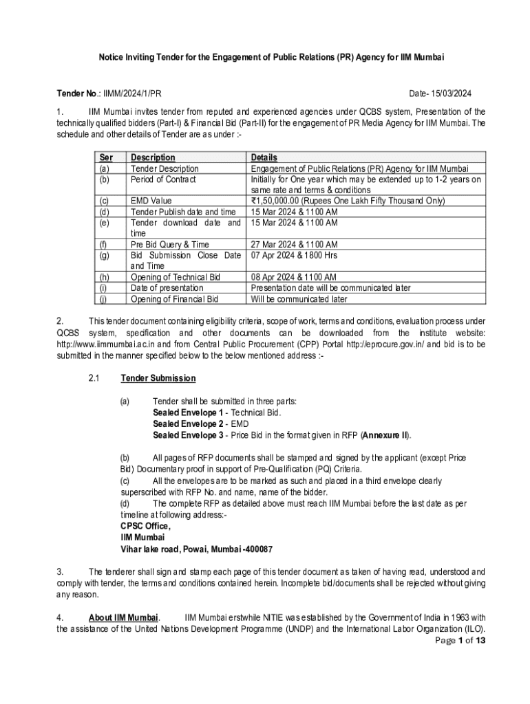 This document invites tenders from reputed agencies for the engagement of a Public Relations (PR) Media Agency for IIM Mumbai, detailing eligibility criteria, submission process, evaluation procedures,