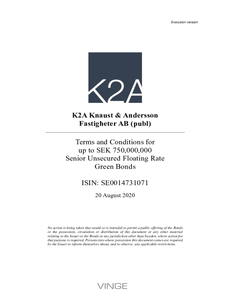 This document outlines the terms and conditions governing the issuance of green bonds by K2A Knaust & Andersson Fastigheter AB, including the rights of bondholders, payment terms, and compliance requirements.