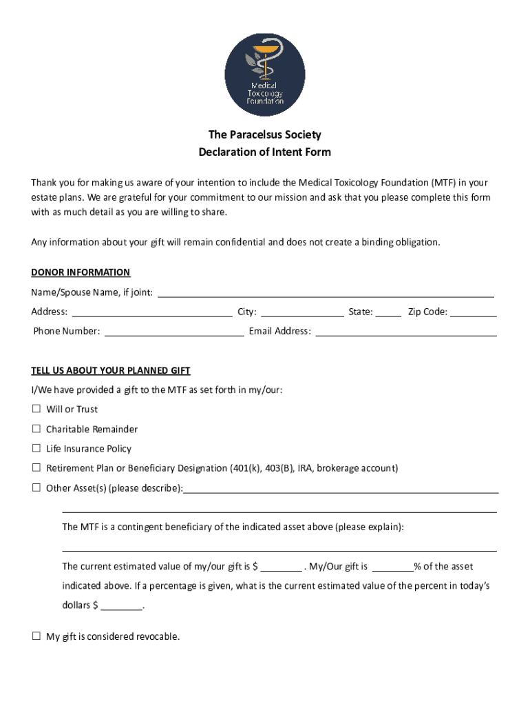This form is for individuals intending to include the Medical Toxicology Foundation (MTF) in their estate plans, allowing donors to specify details about their planned gift.