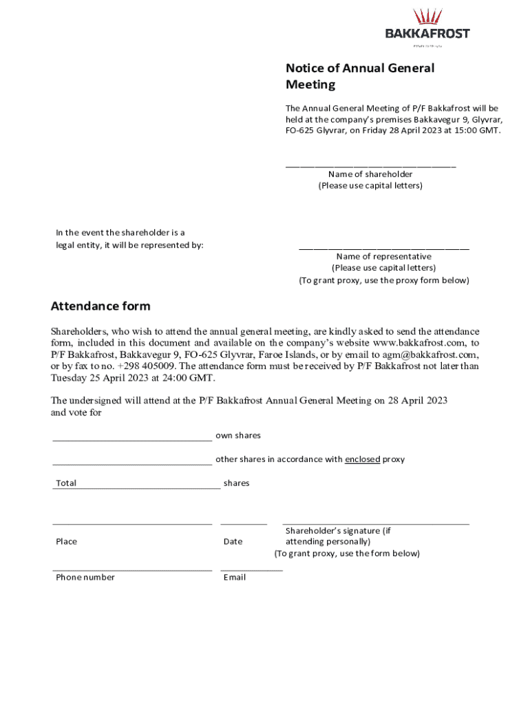 This document provides details regarding the Annual General Meeting of P/F Bakkafrost, including attendance and proxy voting instructions.