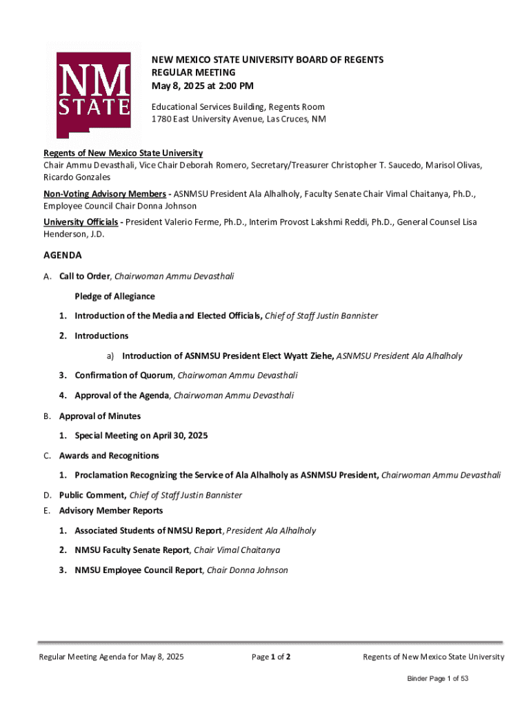 Get the free Nmsu Board of Regents Meeting Minutes - regents nmsu