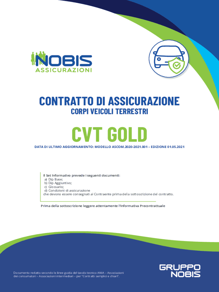 Il documento è un contratto di assicurazione per corpi veicoli terrestri che dettaglia le coperture assicurative, le condizioni generali, i diritti e doveri delle parti coinvolte, e le modalità