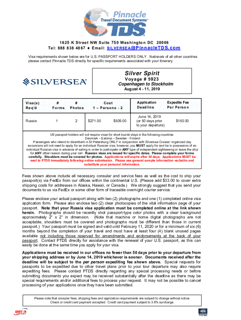 This document provides the necessary instructions and requirements for U.S. passport holders applying for a visa to visit Russia, specifically for travelers on the Silver Spirit cruise from Copenhagen