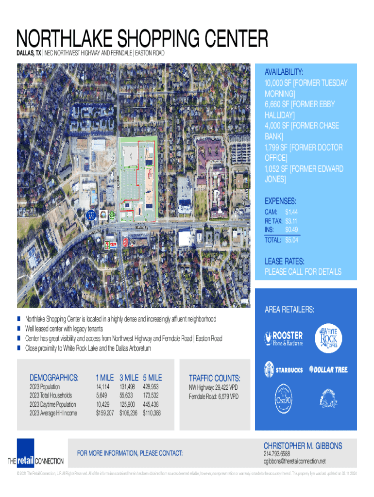 This document provides information on available retail spaces at Northlake Shopping Center in Dallas, TX, including lease rates, expenses, traffic counts, and demographics of the surrounding area.