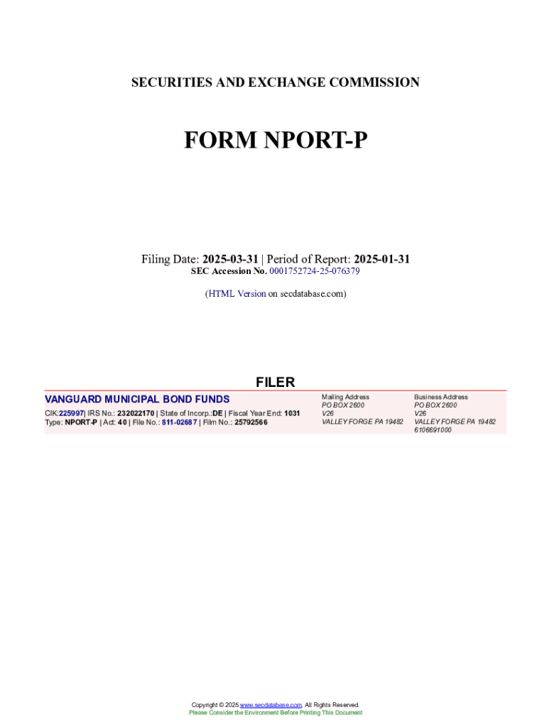 This document provides a quarterly report for the Vanguard Municipal Bond Funds, detailing the fund\'s portfolio holdings as of January 31, 2025, including investments, market values, and relevant