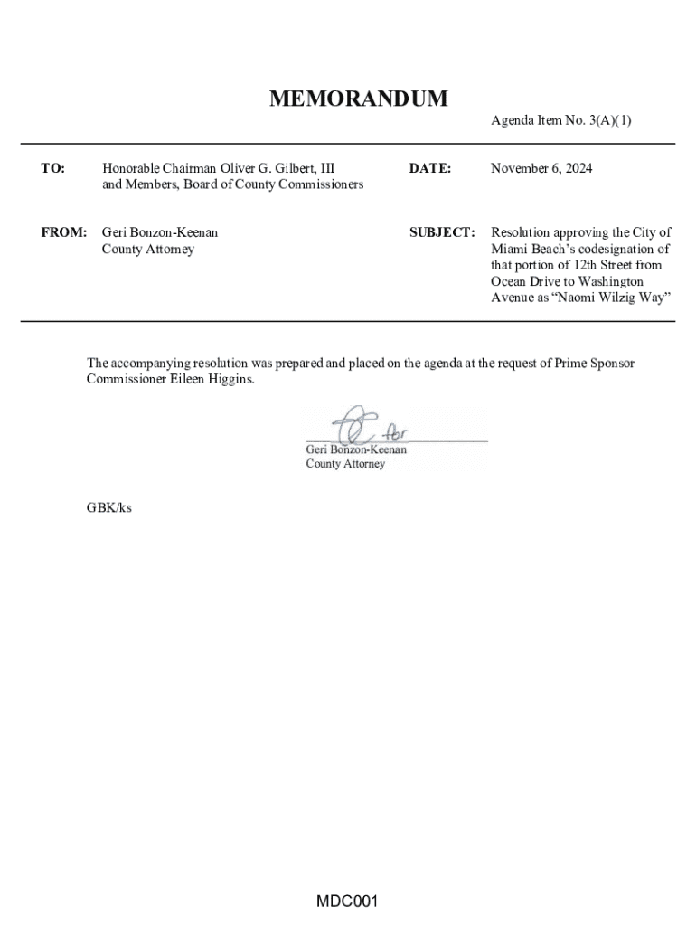 MEMORANDUMAgenda Item No. 3(A)(1)TO:Honorable Chairman Oliver G. Gilbert, III and Members, Board of County CommissionersDATE:November 6, 2024FROM:Geri BonzonKeenan County AttorneySUBJECT:Resolution