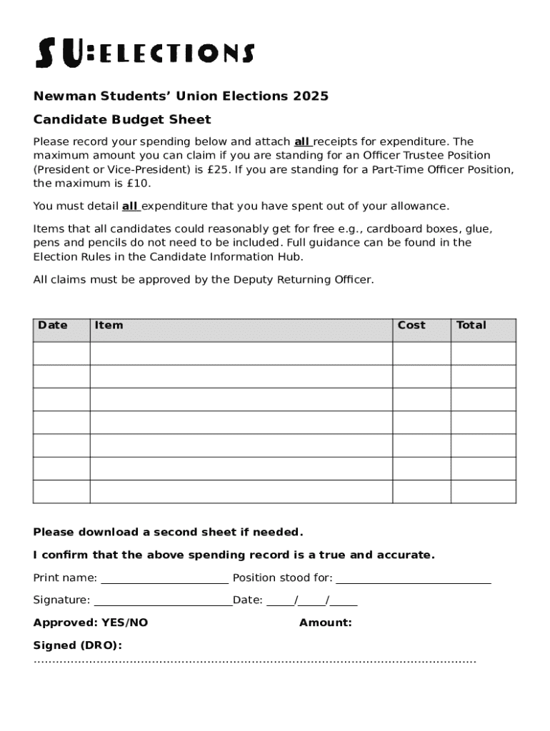 Newman Students' Union Elections 2025 Candidate Budget Sheet template instructions