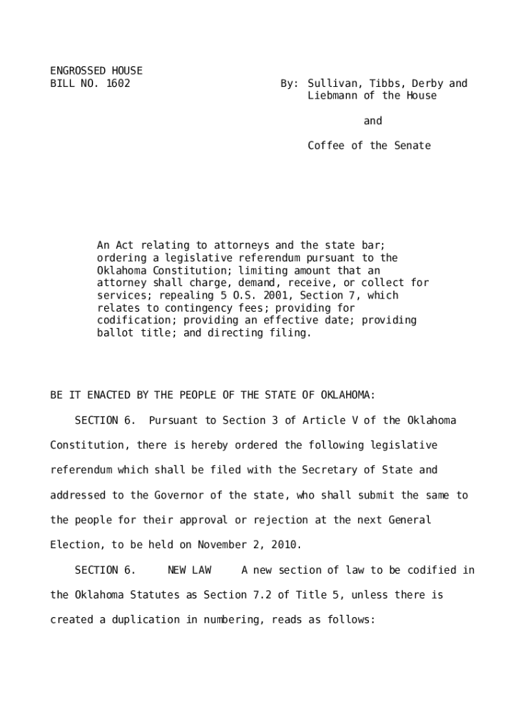 This document outlines a legislative referendum regarding attorney fees in Oklahoma, including limits on contingency fees and the repeal of existing laws related to attorneys\' fees.
