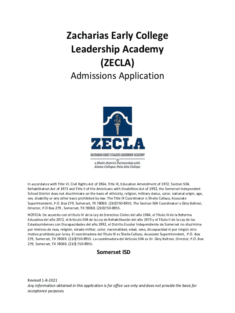 Get the free Zacharias Early College Leadership Academy Admissions Application