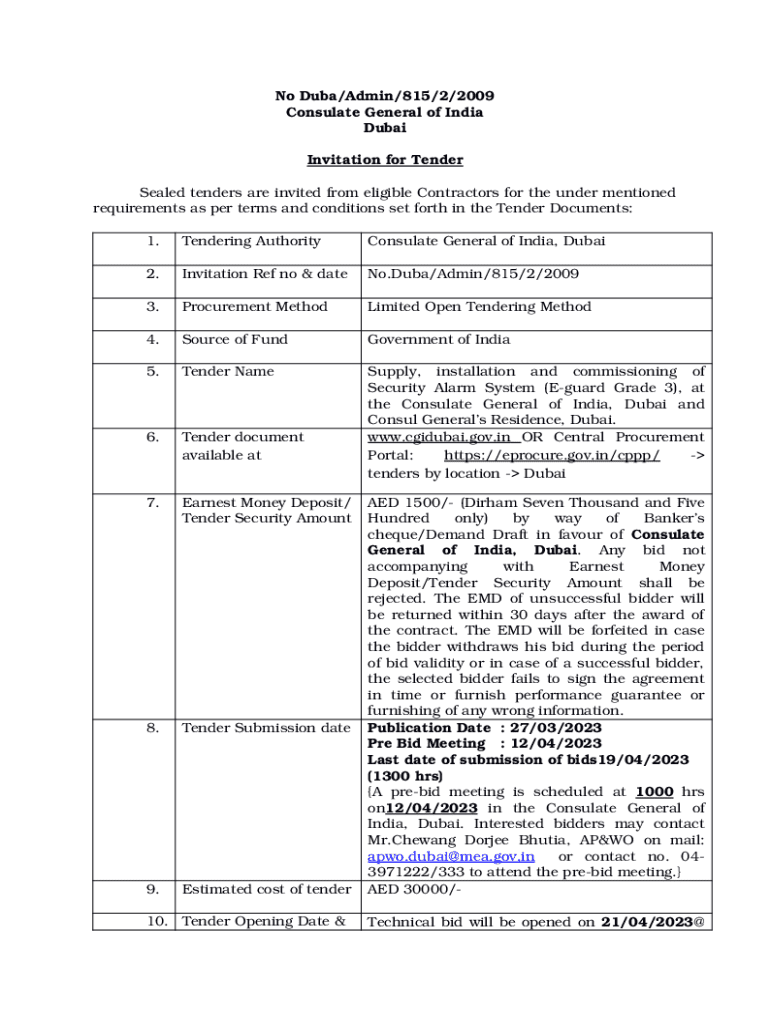 Sealed tenders are invited from eligible Contractors for the supply, installation, and commissioning of a Security Alarm System at the Consulate General of India in Dubai.