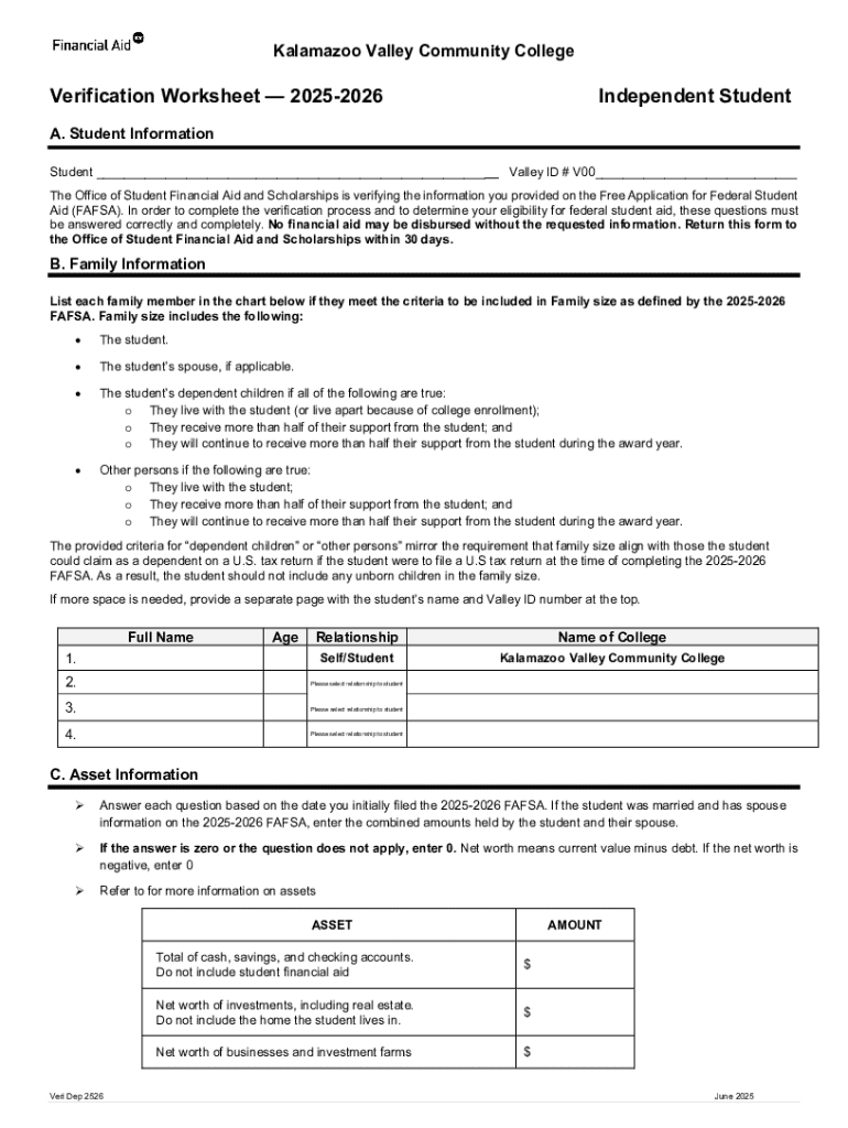 This document is used by independent students at Kalamazoo Valley Community College to verify information for their financial aid applications as required by the FAFSA for the 2025-2026 academic year.