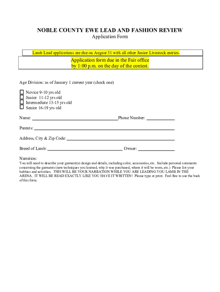 This application form is for participants of the Noble County Ewe Lead and Fashion Review contest, detailing requirements for entries and personal information collection.