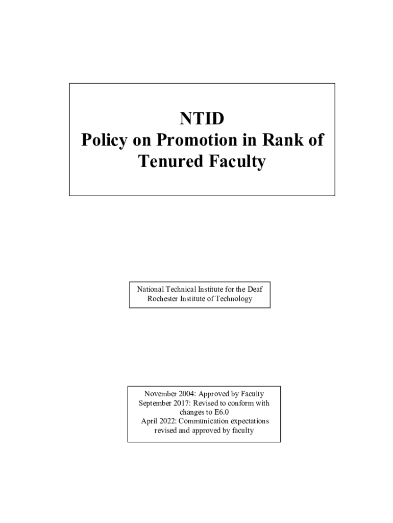 This document outlines the policy and procedures for the promotion of tenured faculty at the National Technical Institute for the Deaf (NTID) at Rochester Institute of Technology, including guidelines
