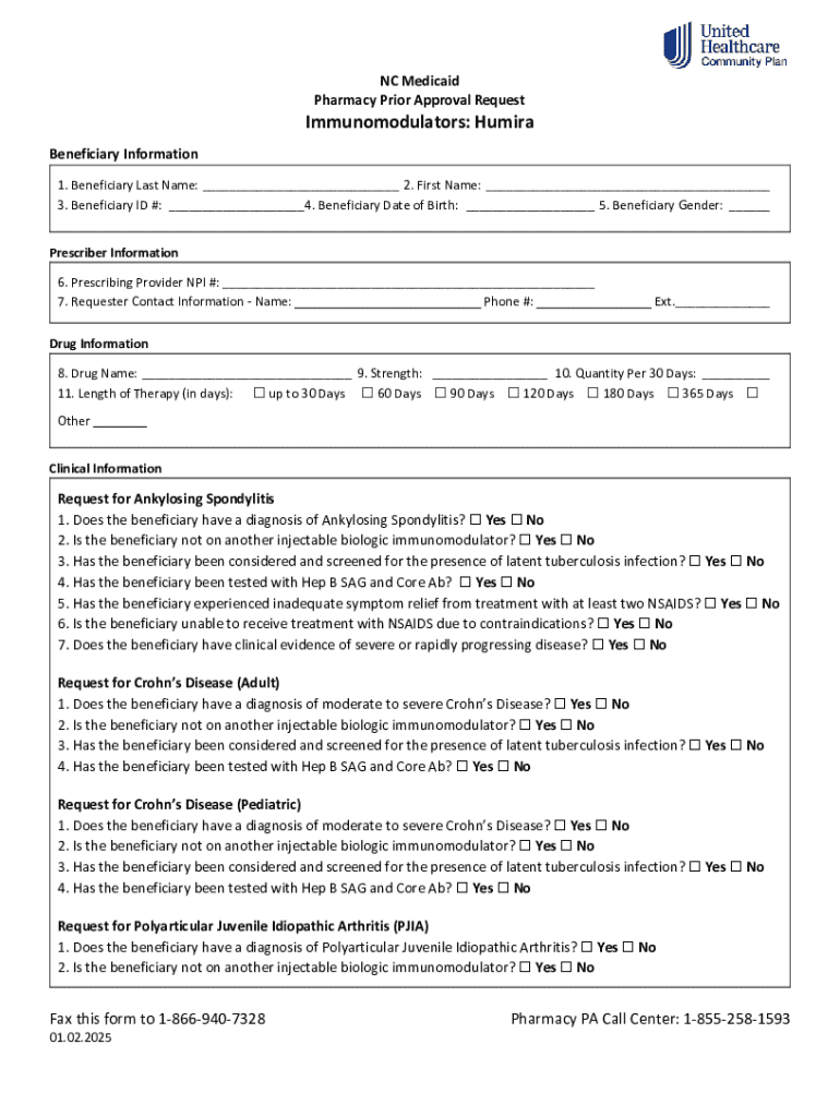 Solicitud de aprobación previa para medicamentos de Medicaid de Carolina del Norte, específicamente para inmunomoduladores como , incluyendo información del beneficiario, prescriptor y detalles