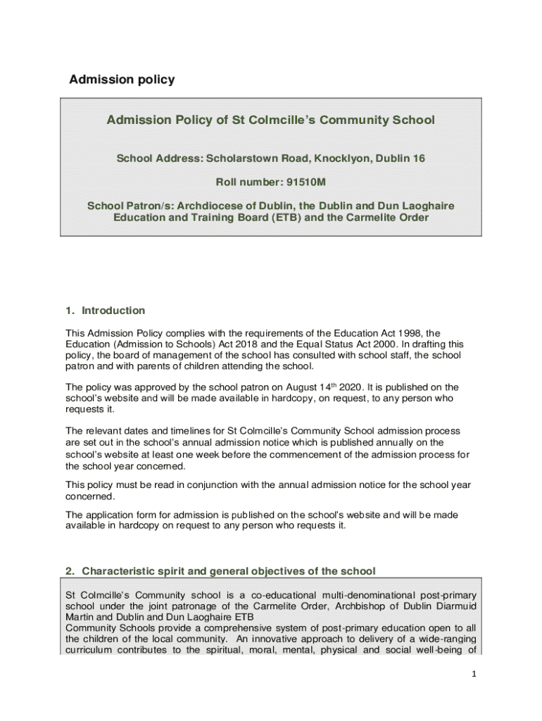 This document outlines the admission policy for St Colmcille’s Community School, detailing the admission process, criteria, and provisions for inclusivity in education while adhering to relevant