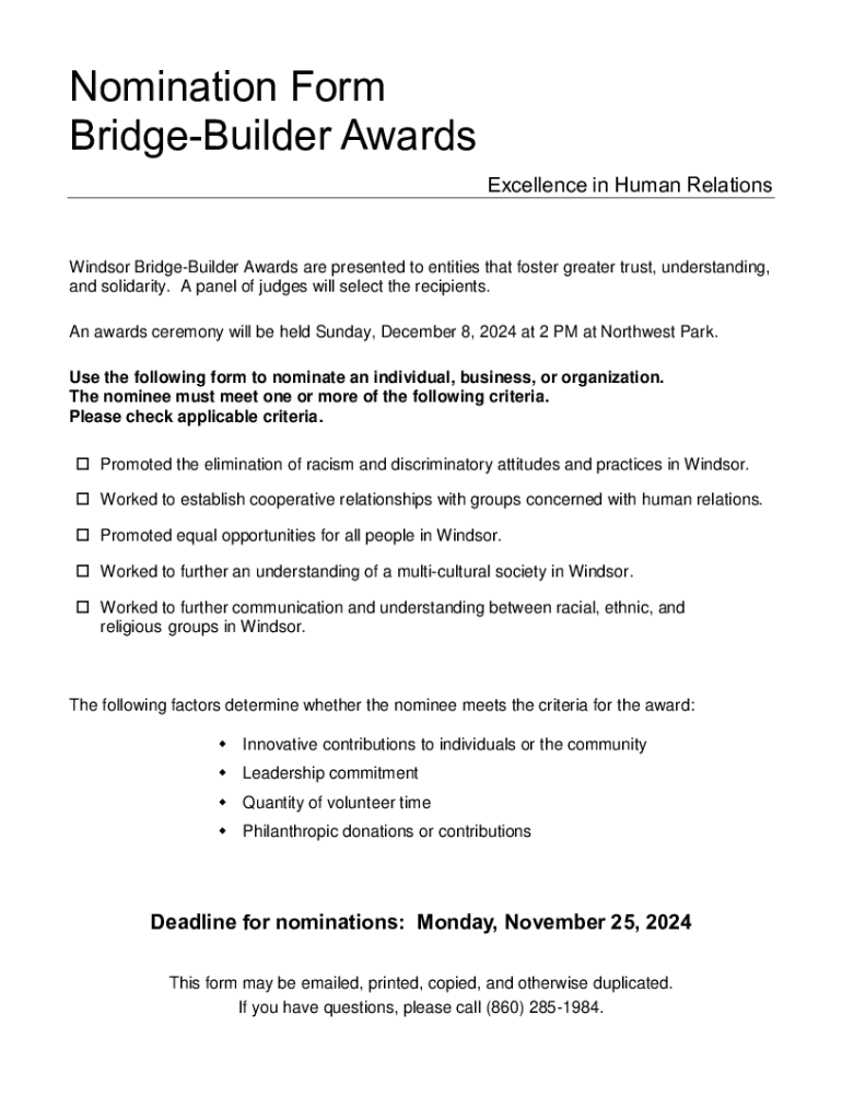 Form to nominate individuals, businesses, or organizations for the Windsor Bridge-Builder Awards, recognizing efforts to foster trust, understanding, and solidarity in human relations.