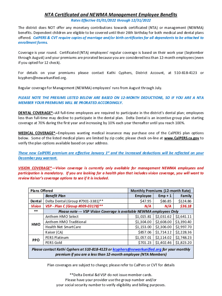 This document outlines the employee benefits for NTA certificated and NEWMA management employees, including information on dental, medical, and vision coverage along with premium rates.