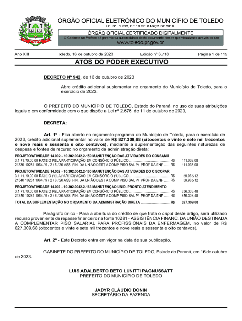 Ano XIIIToledo, 16 de outubro de 2023Edico n 3.718Pgina 1 de 115ATOS DO PODER EXECUTIVO DECRETO N 942, de 16 de outubro de 2023 Abre crdito adicional suplementar no oramento do Municpio de Toledo,