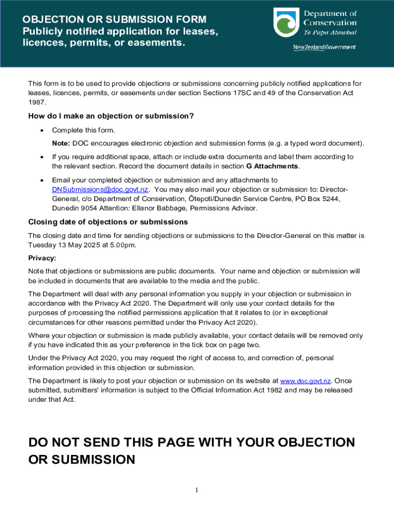 This form is used to provide objections or submissions regarding publicly notified applications for leases, licences, permits, or easements as per the Conservation Act 1987.
