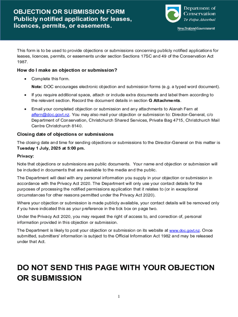 This form is used to provide objections or submissions concerning publicly notified applications under the Conservation Act 1987.