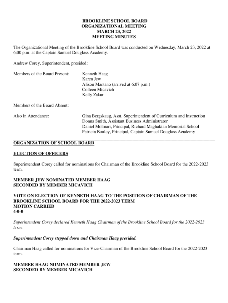 Minutes from the Brookline School Board\'s organizational meeting where officers were elected, various reports were presented, and several motions were discussed and voted upon.
