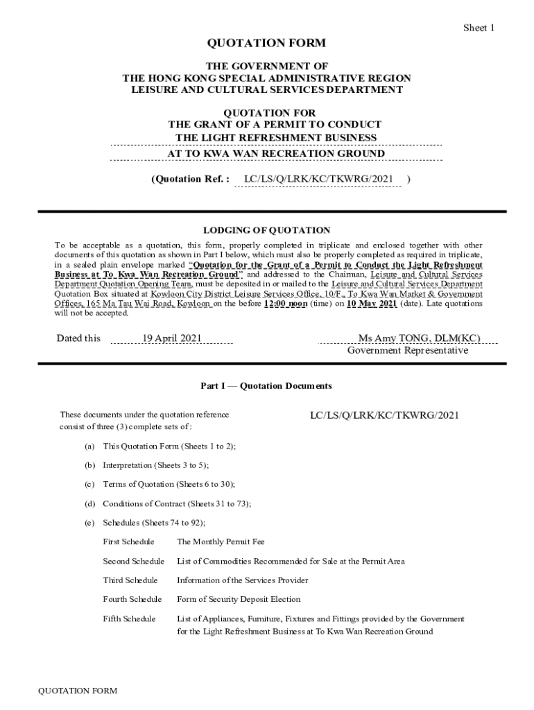 This document serves as a formal quotation form for businesses to apply for a permit to operate a light refreshment service at the To Kwa Wan Recreation Ground in Hong Kong. It includes details on