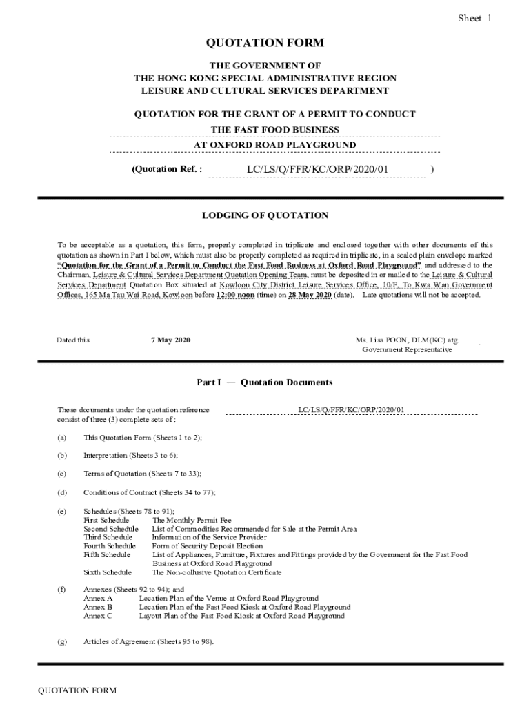 This document serves as a quotation form for service providers to bid for a permit to operate a fast food business at Oxford Road Playground. It includes requirements, schedules and terms related