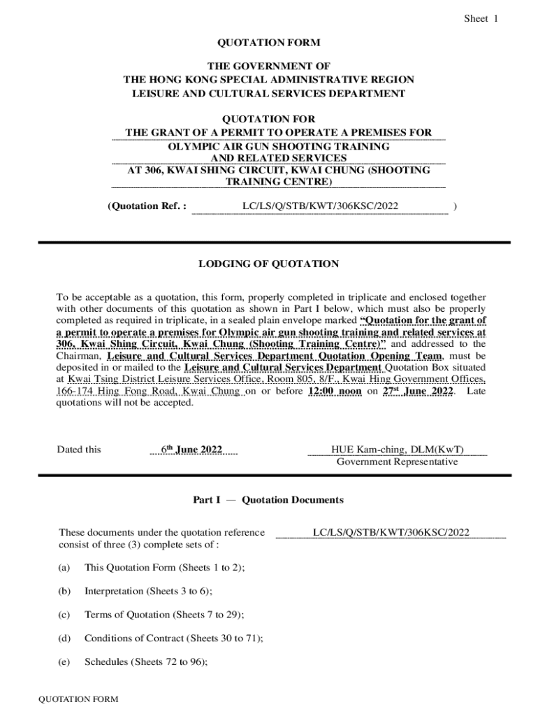 This document serves as a quotation form for submitting applications to operate a premises designated for Olympic air gun shooting training and related services in Hong Kong. It provides guidelines