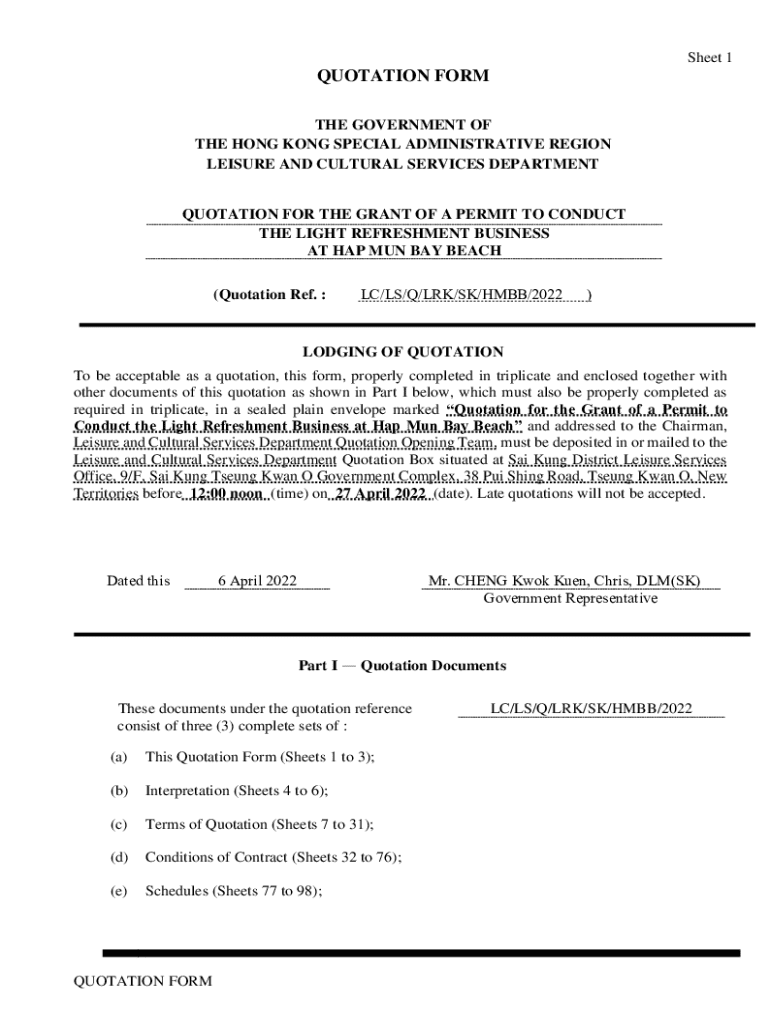 This document serves as a quotation form for obtaining a permit from the Leisure and Cultural Services Department of the Hong Kong Government to conduct a light refreshment business at Hap Mun Bay